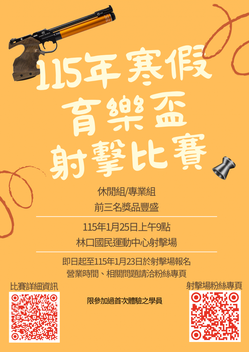 115年寒假育樂盃射擊比賽 新北市射擊協會 X 林口國民運動中心 比賽日期:115年1月25日(星期日) 比賽地點:新北市林口國民運動中心-4樓空氣槍射擊場 報名方式:請至中心四樓射擊場服務台報名 完整比賽說明與報名方式請見: https://drive.google.com/file/d/1Xuqpnw7V0Y3TllaaJIaGBPv_cvcTms3R/view?usp=drivesdk